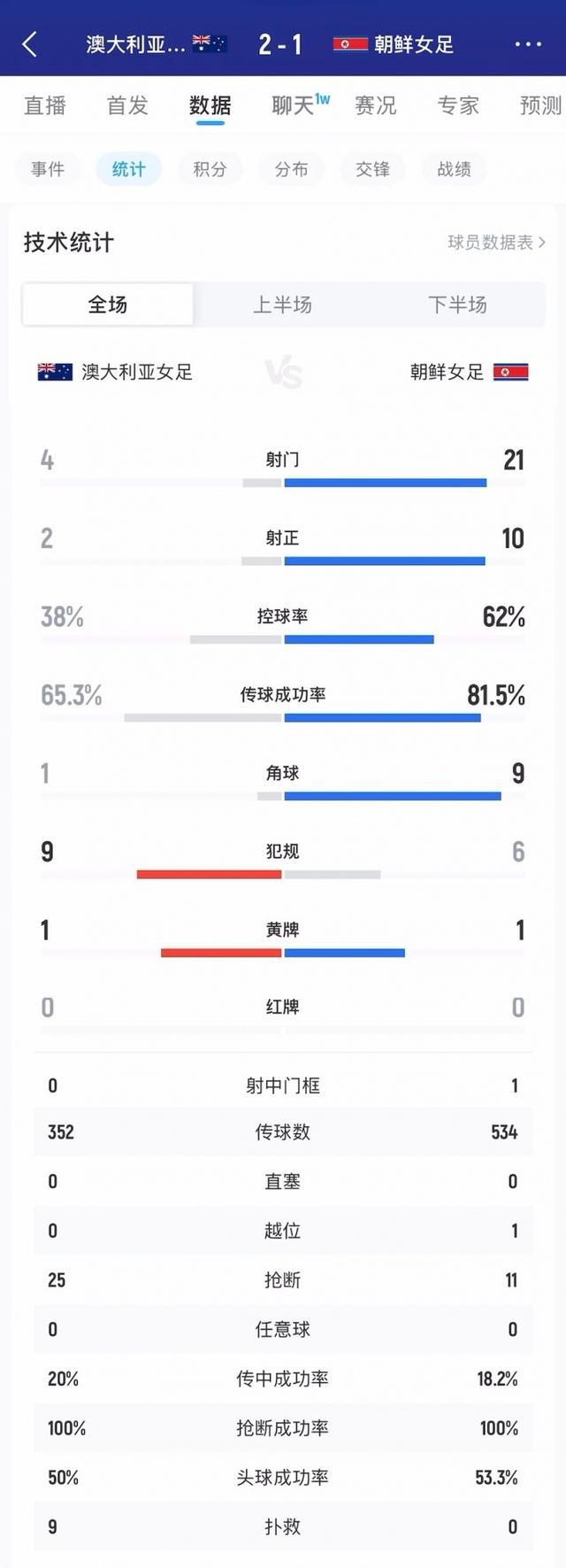 靠谱配资平台 系统局!澳女足2-1朝鲜女足数据:朝鲜狂轰21脚,袋鼠2射正进2球