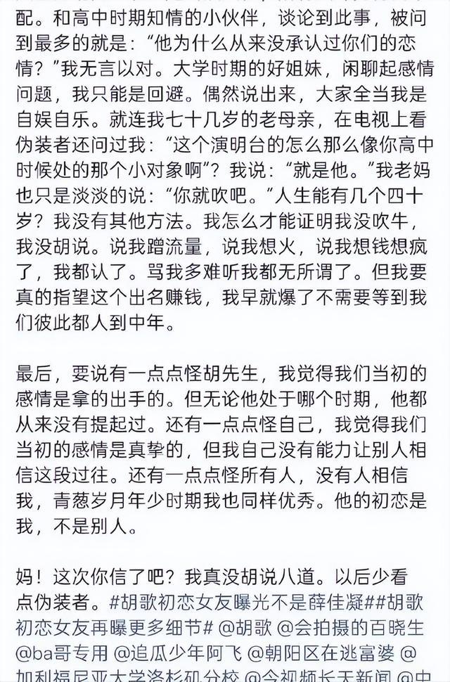 字里行间都是埋怨胡歌成名后不提她,只提薛佳凝,导致她跟人回忆青春时总被当成吹牛,连亲妈都不信。