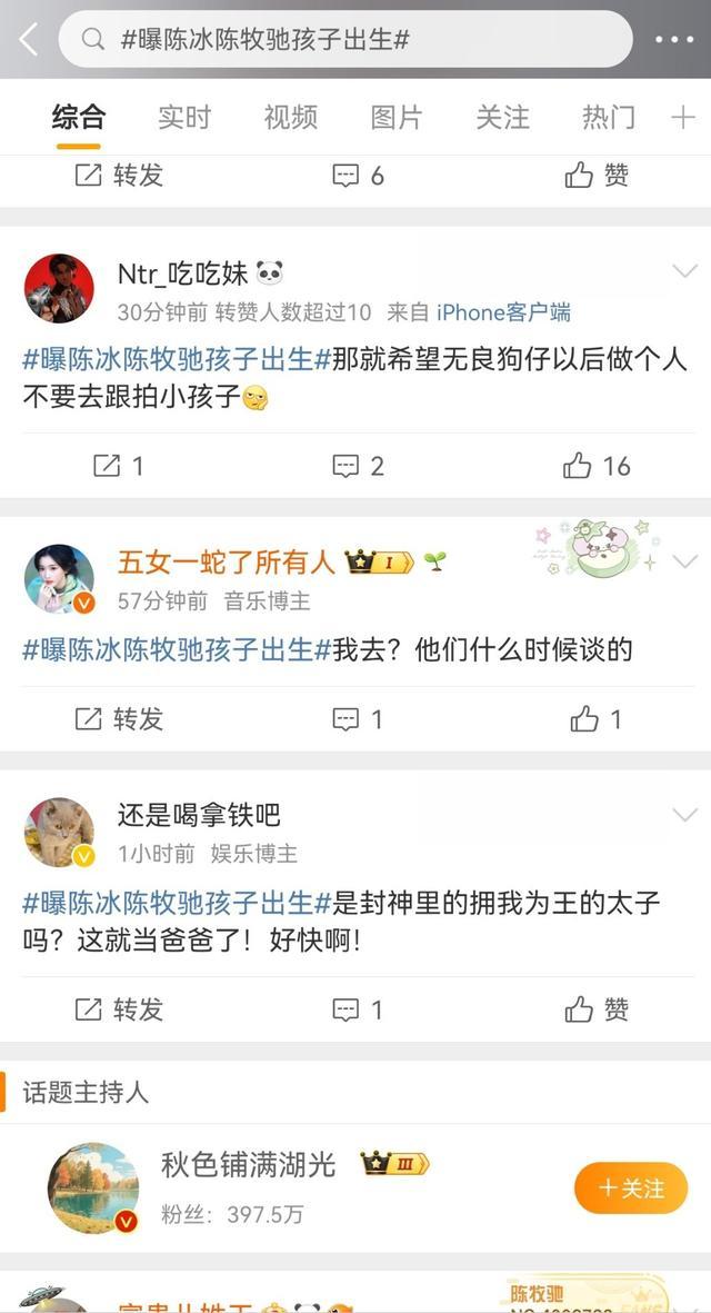 然而就在网友猜测怀孕消息真伪时,狗仔就先一步爆料并坐实生子消息,称陈冰的肚子平平、已经生完娃了。
