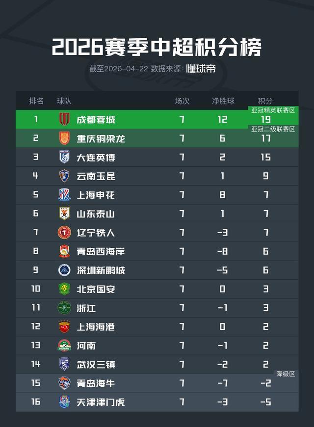 北京时间4月22日,中超第7轮剩下3场比赛结束,上海申花在赢球后上升到第5名,大连英博战胜辽宁铁人后稳坐第3的位置。