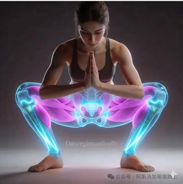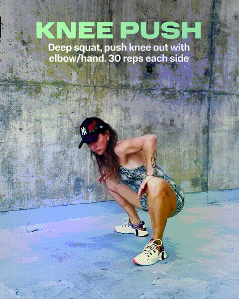 瑜伽蹲准备,用肘部/手部将膝盖向外推。每侧重复30次。