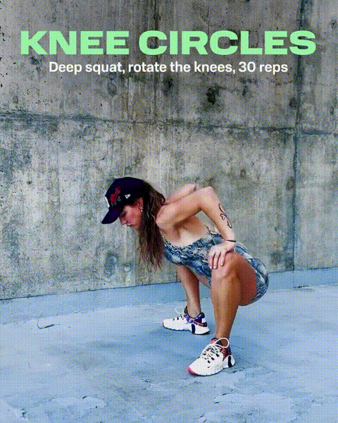 瑜伽蹲准备,旋转膝盖,重复30次。