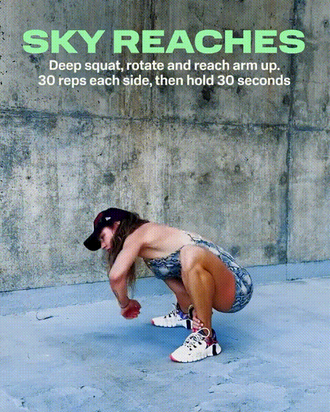 瑜伽蹲准备,将一只手放在你面前的地上(可以的话抓住对侧脚的脚踝),转动你的躯干。将另一只手向斜上方伸出。呼气落回,动态练习5-10组然后换边。
